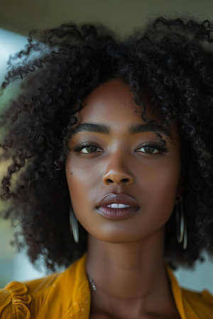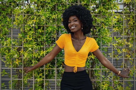 Portrait of a beautiful young african american woman posing against backdrop of green hedge