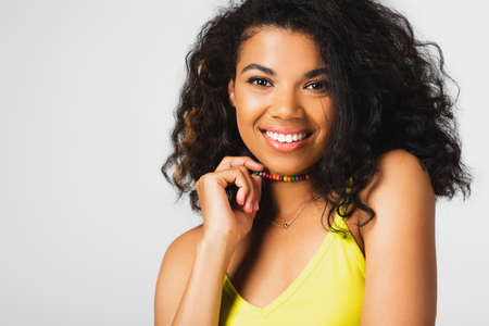 portrait of happy african american woman holding colorful beads and looking at camera isolated on grey
