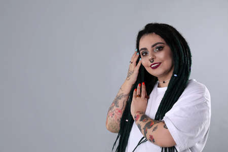 Beautiful young woman with tattoos on arms, nose piercing and dreadlocks against gray background. Space for text