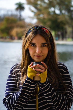 A pretty caucasian woman holding a cup of coffee while standing against a lake at park