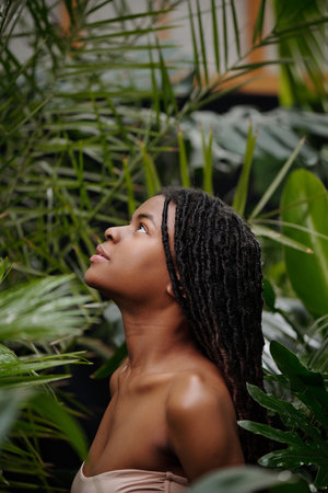 Young woman with braided hair gazing upwards, standing amidst dense, vibrant green foliage, evoking a sense of peace and connection with nature