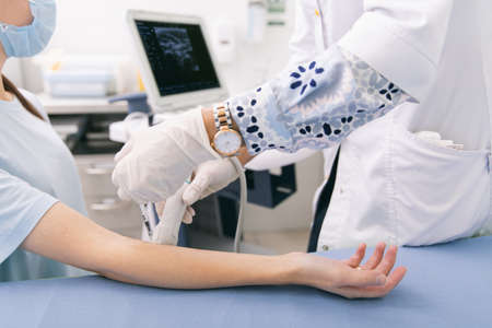 Doctor doing the ultrasound on the hand close up. Doctor demonstrates results of ultrasound to patient. Medical ultrasound scan. Rehabilitation application of Botox injection for muscle relaxation.