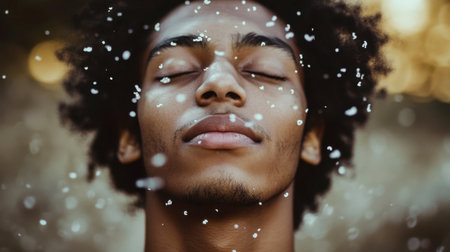 A serene portrait of a young man with closed eyes enjoying the peacefulness of falling snowflakes, capturing a moment of tranquility and joy in nature.