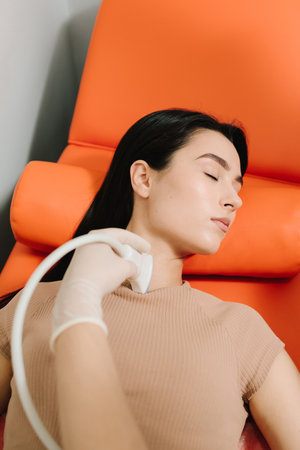 Ultrasound Procedure with Patient. Doctor performs an ultrasound examination on the patient using a handheld probe. Girl undergoes an ultrasound test as the probe captures internal structures