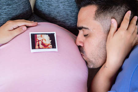 close-up man lying on bed kissing the belly of his pregnant wife, with the printed ultrasound photo on the belly.
