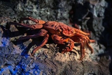 Stuffed red crab on rocky ocean bottom. Vibrant red coloured crab with big claws, seafood, shellfish.