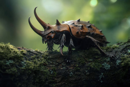 A photograph of an angry rhinoceros beetle, side view, crawling on a tree branch, macro photography, nature background, green bokeh, macro lens, macro shot, macro detail, macro photography. --ar 3:2 --v 6.1 Job ID: fadc3850-f46b-48c9-bc00-32fc343d076b