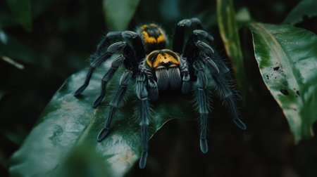 A vibrant tarantula rests on a green leaf amidst dense foliage in a tropical rainforest