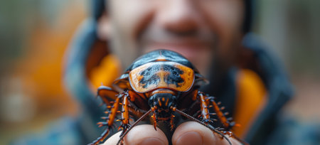 Man holding a Madagascar hissing cockroach outdoors. Gentle interaction with nature. Concept of exotic pets, entomology, wildlife handling, outdoor learning, and insect education.
