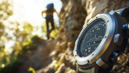Close up of a smartwatch displaying altitude data, with a blurred hiker ascending a rocky mountain trail in the background
