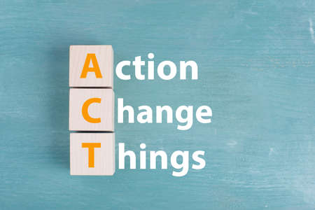 The words action, change, things are standing on a blue colored background, business concept