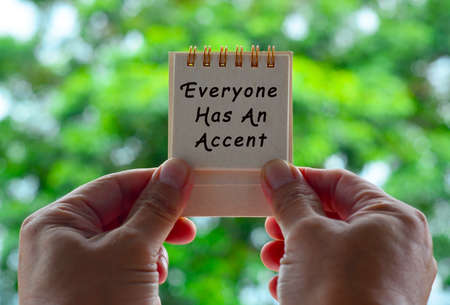 Hands Holding A White Notepad With Text Written And Blurred Green Background. Everyone Has An Accent