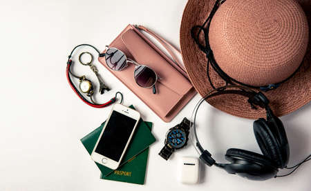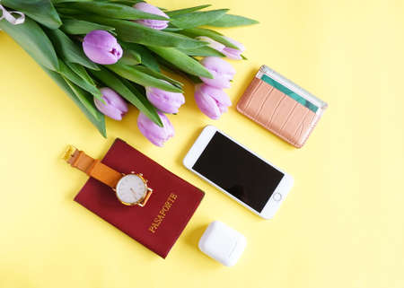 Unisex travel flat lay on yellow background