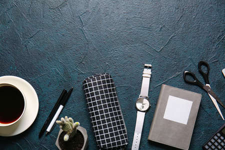Stylish pencil case, wrist watch, cup of coffee and stationery on dark background, closeup