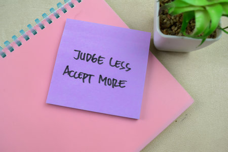 Concept of Judge Less Accept More write on sticky notes isolated on Wooden Table.