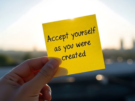 A hand holding a yellow sticky note with the motivational message 'Accept yourself as you were created' against a blurred background of a serene landscape, symbolizing self-acceptance and positivity.