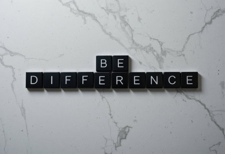 A creative arrangement of black letter tiles spelling BE DIFFERENCE on a marble surface. This inspirational image represents positivity and motivation for personal growth.