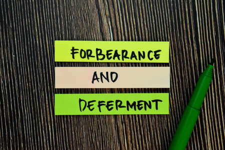 Forbearance and Deferment write on sticky notes isolated on Wooden Table.