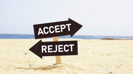 Accept and reject on directional arrow signs. The decision, choice or dilemma between accepting or rejecting