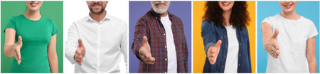 People welcoming on different color backgrounds, closeup. Collage with photos