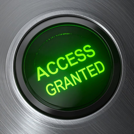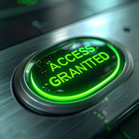 A macro shot of a control button glowing with a bright green light, displaying the words 'ACCESS GRANTED'.