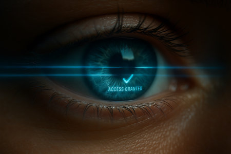 A close-up of a human eye undergoing a futuristic biometric scan, featuring a blue light beam scanning the iris and digital text displaying 'ACCESS GRANTED' with a checkmark. This image represents advanced security, identity verification, and access control technology.