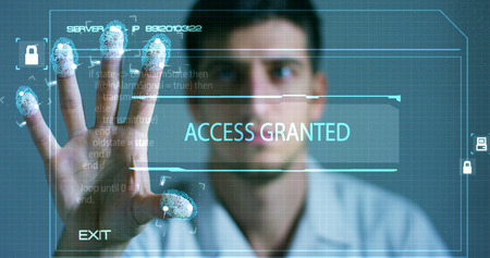 Concept of the future of security and password control through advanced technology. Fingerprint scan provides safe access with biometrics identification. Multi exposure.