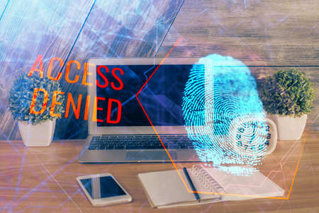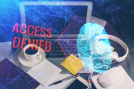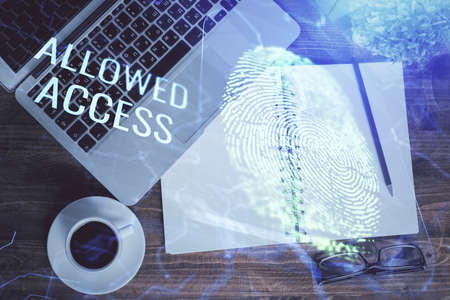 Finger print over computer on the desktop background. Top view. Double exposure. Concept of securitization.