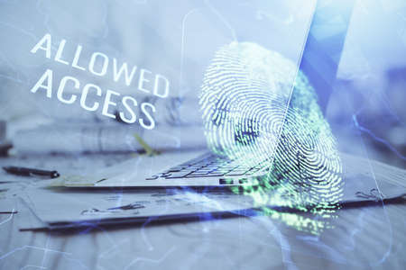 Computer on laptop in office with finger print drawing. Double exposure. Concept of business data security.
