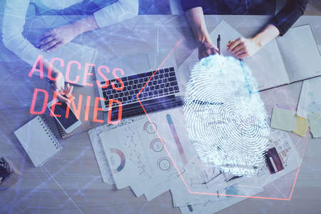 Double exposure of fingerprint hologram and man and woman working together holding and using a mobile device. Security concept