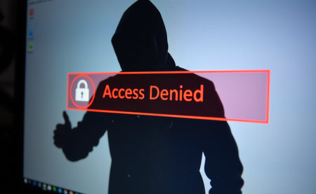 A shadow hacker in front of a computer screen displaying Access Denied in red text, representing cybersecurity threats and hacking.