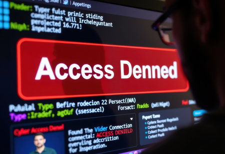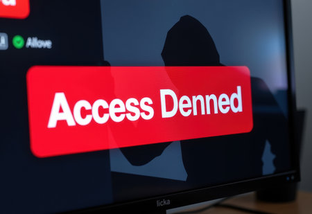A computer monitor shows an access denied screen against a scenic landscape backdrop This image conveys digital security concerns and is ideal for cybersecurity illustrations.