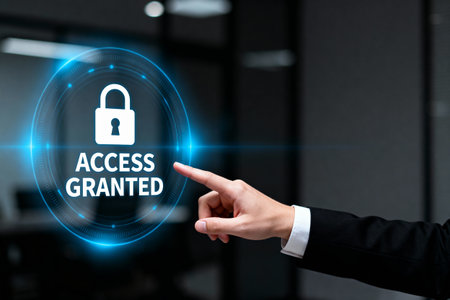 A hand in a suit holds a glowing digital padlock with the words 'Access Granted', symbolizing security and permission in a business setting.