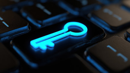 A glowing blue key symbol on a keyboard represents protection against keyloggers, emphasizing safe typing and privacy.