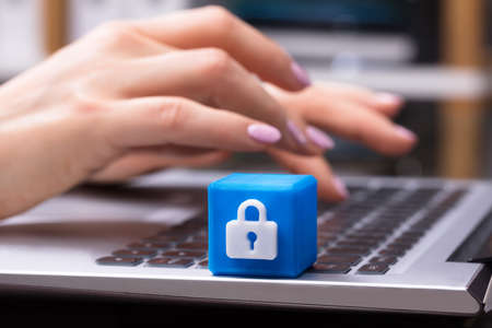 Businesswoman Working On Laptop With Blue Cubic Block Showing Lock Symbol