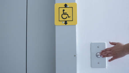 a person calling an elevator in a building for a disabled person, a woman's hand pressing a call button for an elevator with a yellow icon of the ability to move people with disabilities