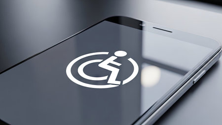 A close-up view presents a smartphone displaying a white accessibility symbol against a dark screen. The device rests on a black surface. The composition uses shallow depth of field, focusing on the screen's details and reflections. The image could be used for articles about technology or inclusion.