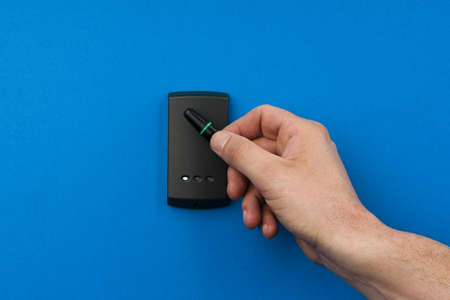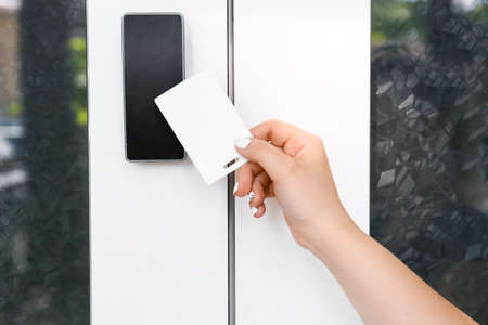 Hand approaching a card to an rfid reader to open a security door. High quality photo