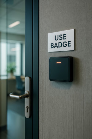 An access control panel is installed on an office door with a badge required sign