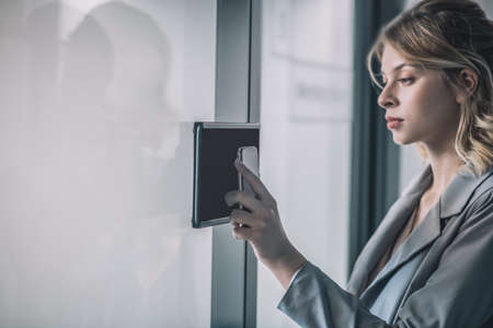 Woman touching smartphone to intercom at office