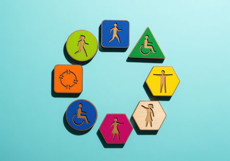 Graphic wooden tokens arranged in a circle on a turquoise background, featuring various symbols representing diversity, inclusion, and accessibility with a minimalist aesthetic