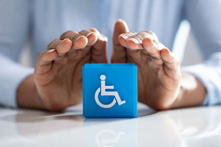 Close-up Of A Human's Hand Protecting Blue Cubic Block With Disabled Handicap Icon