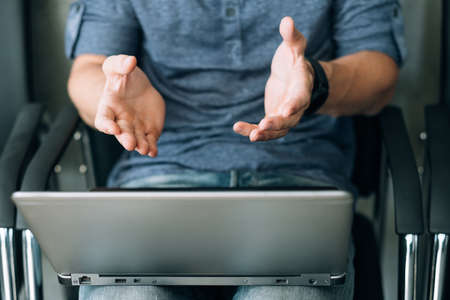 explanation and communication. man hands gesticulate in front of laptop.
