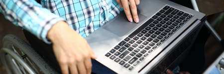 Female hands working on laptop while sitting in wheelchair