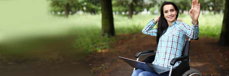 Woman in wheelchair in park with laptop on lap closeup