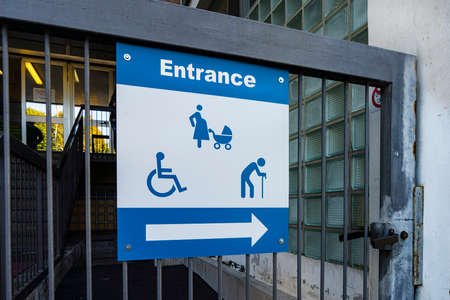Living house entrance equipped with special lifting platform for wheelchair users. wheelchair sign