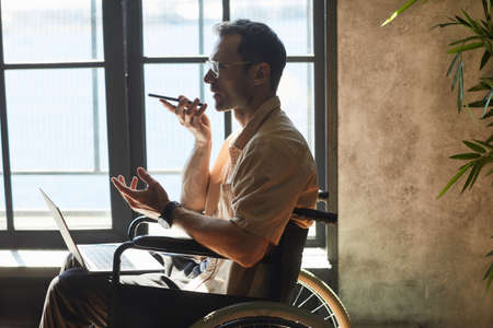 Side view portrait of modern adult man in wheelchair using smartphone while working at home by window , copy space