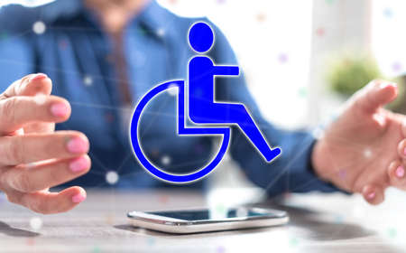 Smartphone with disability insurance concept between hands of a woman in background