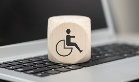 Wooden block with symbol of disability concept on laptop keyboard