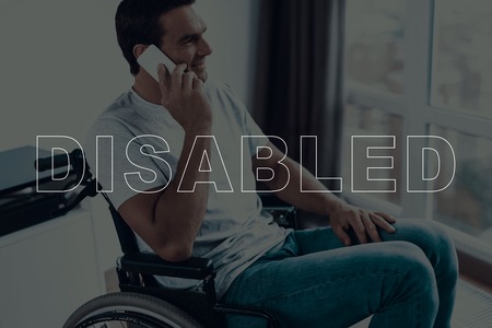 Disabled Man in a Wheelchair. Man Sits in Front of Window. Man Talking on Mobile Phone. Man Have Call on Smartphone. Man is Happy and Smiling. Adult Brunette Man. Man Located in the Living Room.